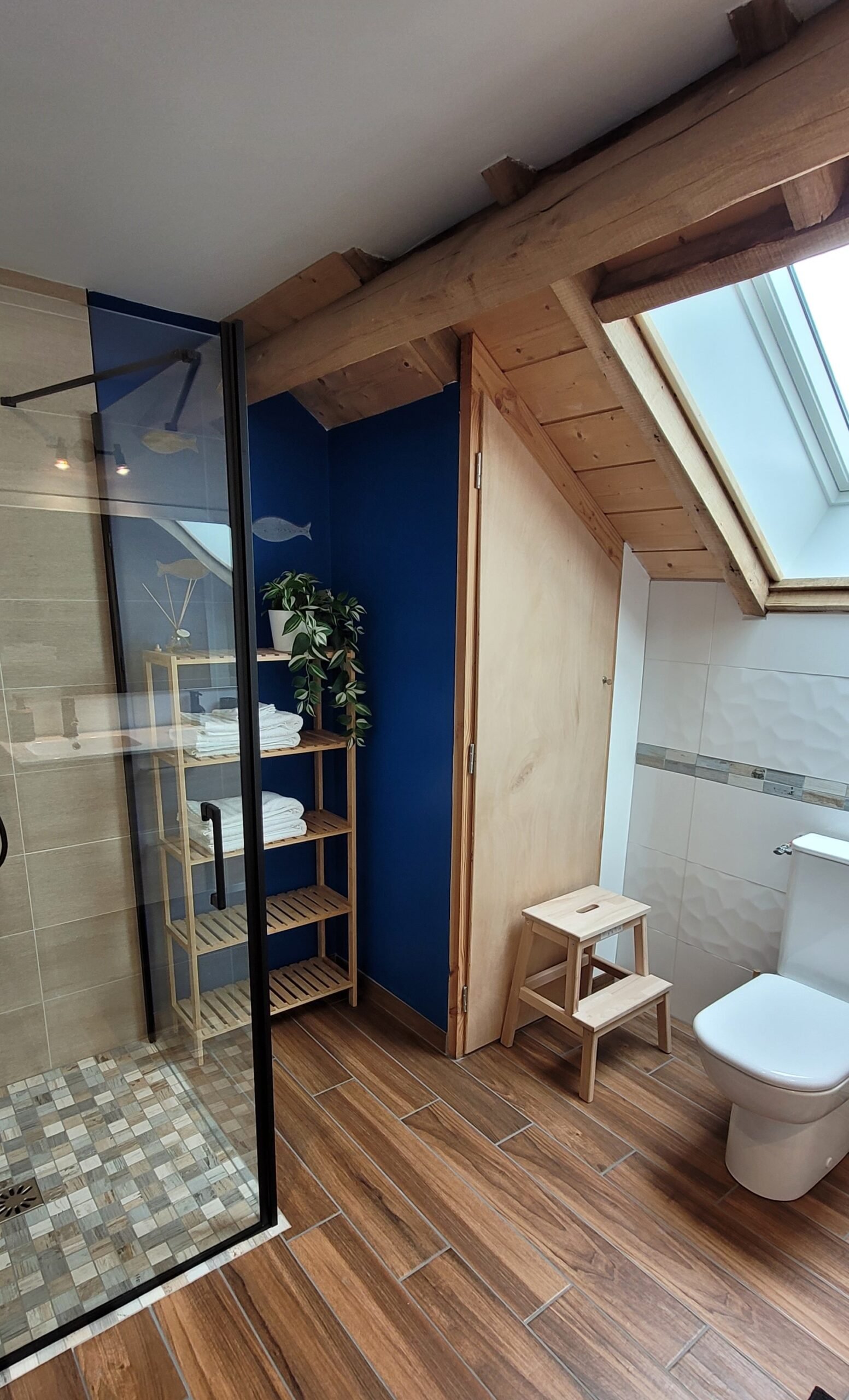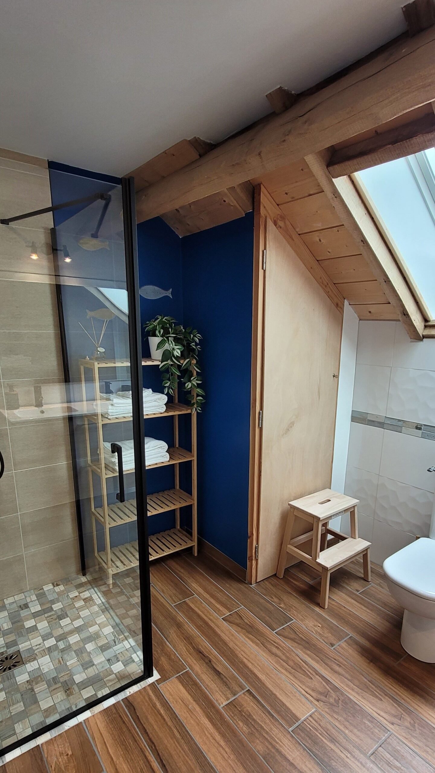 Vous bénéficiez d’une salle de bain privative dans la suite, équipée d’une douche à l’italienne et d’une double vasque. Un mini-réfrigérateur est également à votre disposition pour conserver boissons et petits encas au frais.
